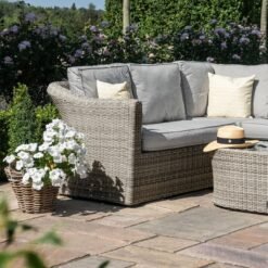 The Oxford range combines the classic weave with a beautiful grey coloured weave that creates a timeless finish. The grey coloured cushions sit perfectly with the weave, creating a modern, elegant style. We recommend storing cushions inside overnight. As with all Maze products, it is made from the highest quality material, woven onto a powder-coated aluminium frame that ensures its use all year. The Oxford Small Corner Group is recognisable for the thick shaped arms and backs to the set.