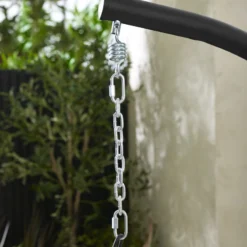 Our outdoor hanging egg chair is the perfect swing chair for creating a little oasis in your garden, sunroom or deck patio. The egg-shaped frame is woven with a textured PE rattan weave for a natural look which is complimented by the dark cushions which will hug you from all sides. The seat is suspended from a sturdy black steel chain, which hangs from a black metal curved arm, securely balanced on four feet, with black plastic non-scratch caps on the feet. This hanging egg seat brings all the boho industrial flair with some serious comfort. Constructed from a sturdy steel black powder-coated frame with the seat basket wrapped in PE rattan. The frame is UV and weather resistant so shouldn’t fade. The cushions are splash proof (so if any spills occur, pick up the cushion and give it a firm pat on the underside to encourage the droplets to roll off). However, the cushions should not be left outside or in damp conditions. Store them somewhere warm and dry. If they do get wet then allow them to fully dry in the sun or somewhere warm before you store them. This set includes a FREE water resistant cover but please note, this is not fully waterproof and you should still store your cushions somewhere dry during wet weather and through winter. Comes with 1 year warranty, so you can shop with peace of mind. Assembly required – easy to follow instructions are provided.