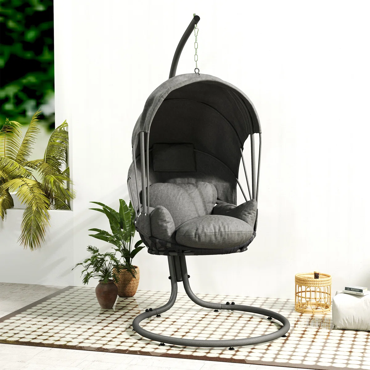 Make the most of your lazy days with this modern egg chair with stand from Outsunny. The retractable canopy, curved back, spacious seat and soft cushion offer a comfortable sitting experience. The hanging stand of the swinging egg chair is crafted from steel so it’s strong, with a large base for balance. Easy to store with a foldable seating basket, space-saving and convenient. Relax and unwind, whenever you want.- Retractable polyester canopy for safe shade on sunny days; – Spacious seat, curved back and soft thick cushion ensure comfort; – Solid steel hanging stand for strength, wide base with adjustable feet for balance; – Foldable seating basket for easy storage; – Safety ropes on the base to prevent excessive shaking; – Maximum load 120 kg, assembly required;- Colour: Grey; – Material: Steel, Polyester, PP Cotton; – Overall Dimension: 129L x 100W x 195H cm; – Seating Size: 68W x 70D cm; – Seat Height: 50 cm; – Cushion Size: 50W x 40D cm; – Weight Capacity: 120 kg; – Item Label: 84A-212V71GY;